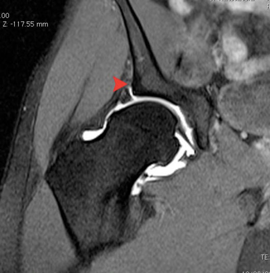 (MRI arthrogram of the hip demonstrating a labral tear. The red arrow demonstrates where the labrum is torn away from the acetabulum)